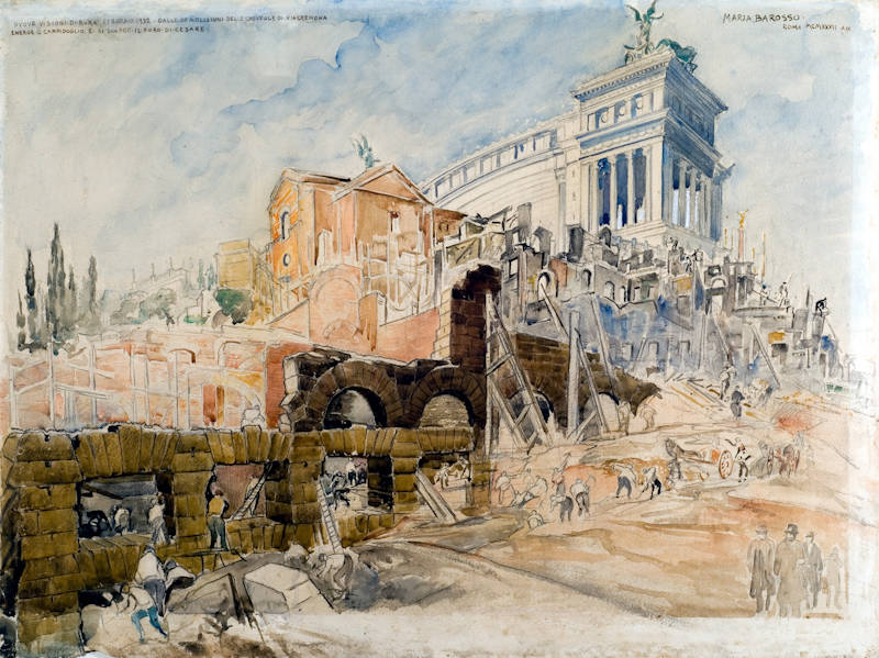 Dalla Basilica di Massenzio all’Area Sacra di largo Argentina, le tavole della Barosso raccontano episodi cruciali: lo sbancamento della Velia, collinetta che collegava Palatino ed Esquilino, eliminata per far spazio alla via dell’Impero (attuale via dei Fori Imperiali) e per creare una scenografia celebrativa paragonata alle grandi imprese ingegneristiche dell’antichità; la sorprendente emersione, tra le macerie di largo Argentina, dei quattro templi repubblicani e della Curia di Pompeo, il luogo dove Giulio Cesare trovò la morte; la demolizione di case e chiese medievali lungo la nuova via del Mare, che isolò ed esaltò i templi del Foro Boario e del Foro Olitorio.